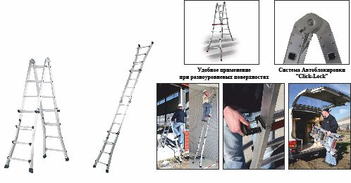 | Не ограничивает рабочего пространства; Запатентованная система автоблокировки “Click-Lock” для избежания неправильного применения; Максимальная дополнительная длина регулировки - 24 см; Удобное применение при разноуровневой поверхности; Максимальная грузоподъемность - 150 кг; Компактная система позволяет перевозить стремянку в багажнике |